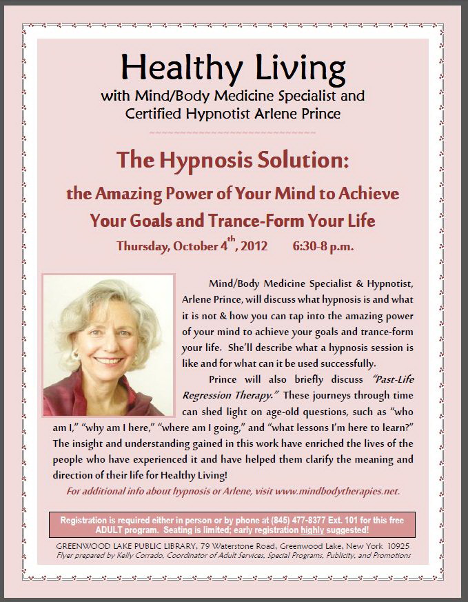 Arlene Prince will be speaking from her experience as a certified hypnotist in practice since 1996. She has training from Harvard Medical School in "The Hypnotic Enhancement of Peak Performance in Sports, Academics, the Performing Arts and the Workplace". She has certification in "Past Life Regression Therapy" with Dr. Brian Weiss, MD.